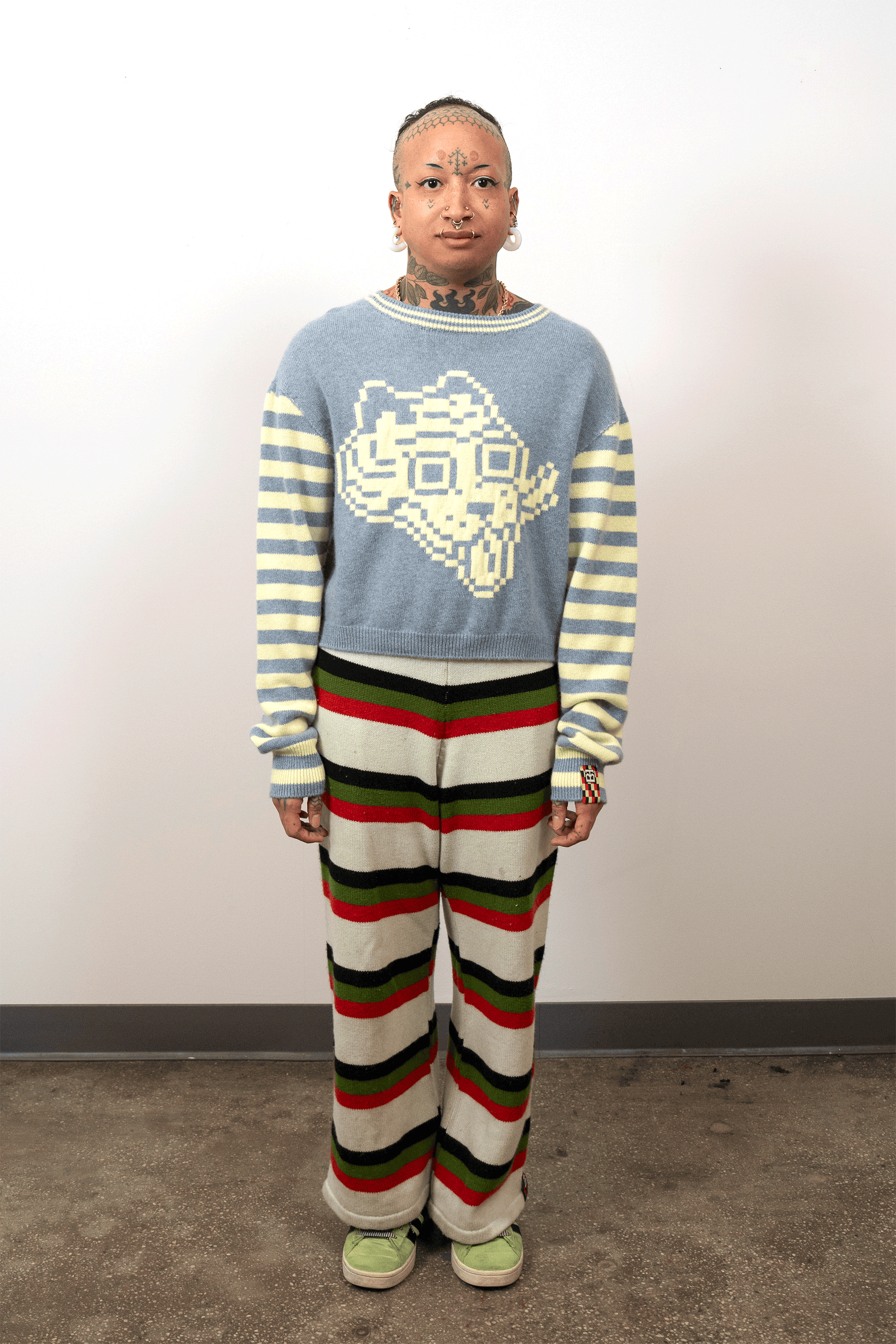 Cropped boxy long sleeve in a thick cashmere blend. This sweater features striped sleeves, a large Tigerbob tiger head on front, and signature TB monogram on the back. Infinitely soft, cozy and wonderful to wear layered or on its own.