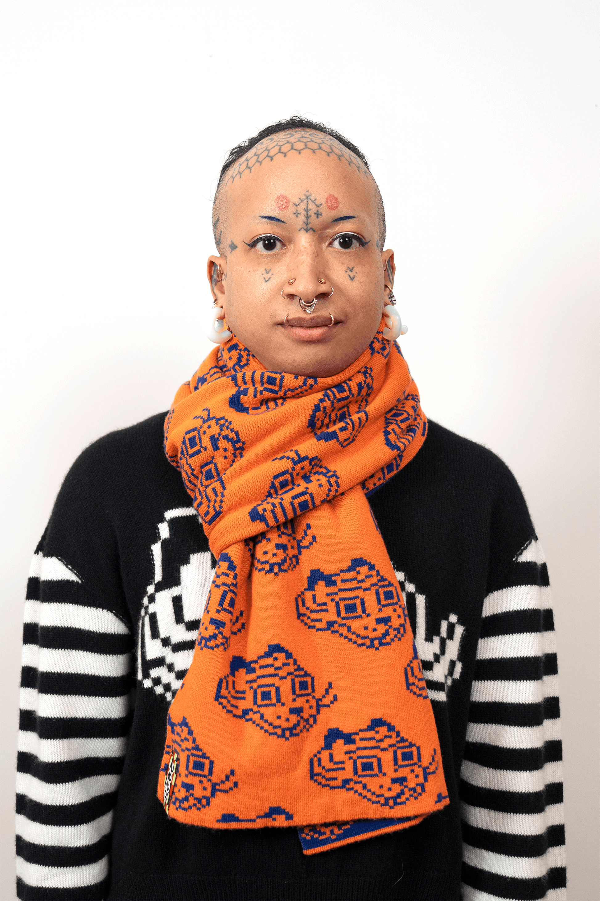 Stay warm and stand out in our new signature reversible scarf. Features a repeating jacquard Tigerbob head pattern on a soft, solid piece of fabric. Drape it over your head as a hood or fold it and tie it as a tight, compact scarf. Two-tone colorway expands your wardrobe possibilities!